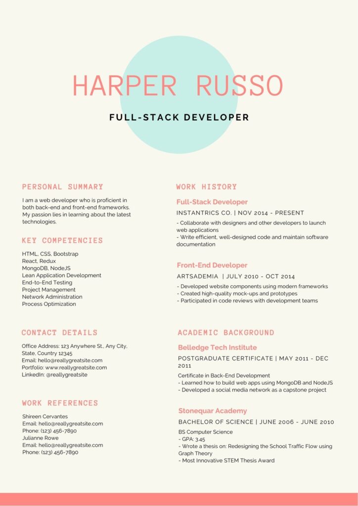 بعدش، از ۲۰۱۵ تا ۲۰۲۳، موج رزومههای رنگی و شلوغ با ابزارهایی مثل Canva اومد. سایدبارها، آیکونها، فونتهای متنوع و حتی عکس پرسنلی به رزومهها اضافه شد. جذاب بودن، اما گاهی وقتها باعث میشدند رزومهها برای سیستمهای ATS یا مدیران استخدام سختتر خونده بشند.