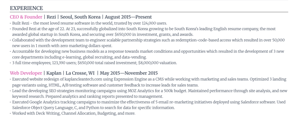 چیدمان باز و خلوتش فضای کافی در اختیارتون میذاره تا تجربههای کاریتون رو بهخوبی برجسته کنید، در حالیکه بولتپوینتها باعث میشند دستاوردهاتون واضح و منظم دیده بشند.